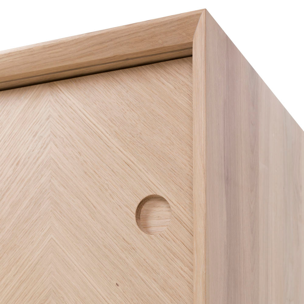 Okrągłe frezowane uchwyty to detal, który zmienia wszystko – subtelny, a jednak charakterystyczny. Smukłe nogi unoszą całość, nadając jej lekkości mimo solidnej konstrukcji z litego drewna.